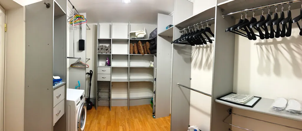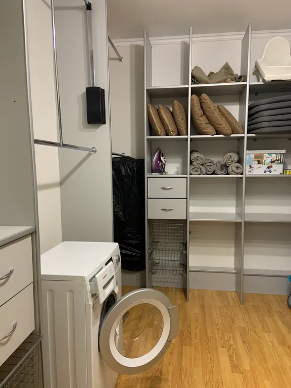 Гардеробная комната: фен, утюг, гладильная доска, сушилка для белья напольная раздвижная, пылесос, швабра, тазик, веник, совок, стиральная машина, подушки для уличной мебели, пледы, порошок для стиральной машины.