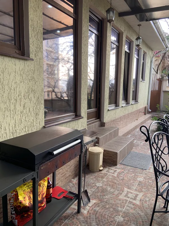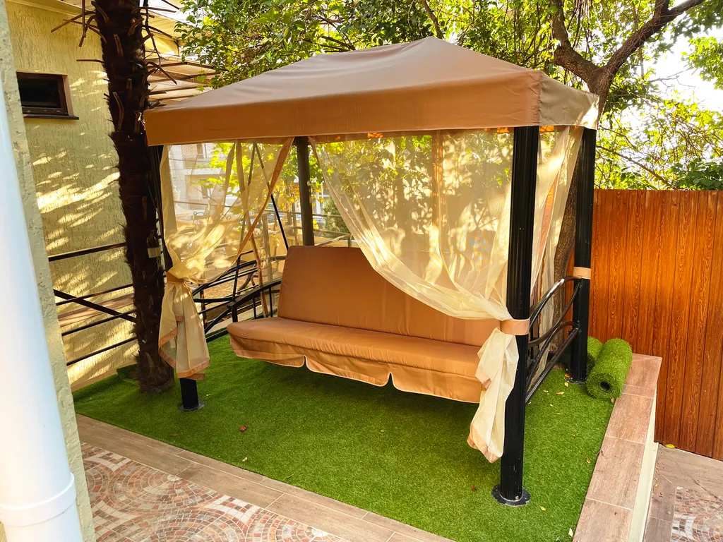 Терраса: уголь, жидкость для розжига, шампура, сетки, посуда для мариновки мяса, садовая мебель, качели. Во внутреннем дворике — шезлонги для отдыха, качели, детская зона (домик для малышей, детские качели).
