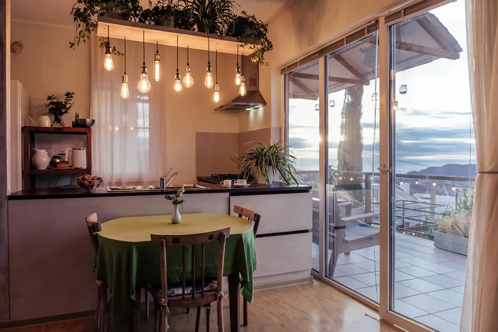 Включать свет на кухне, в гостиной, подсветку в углу гостиной и освещение на террасе.