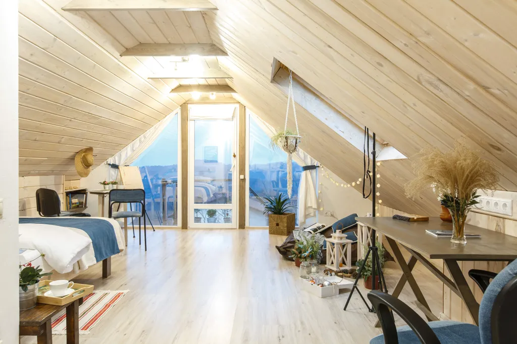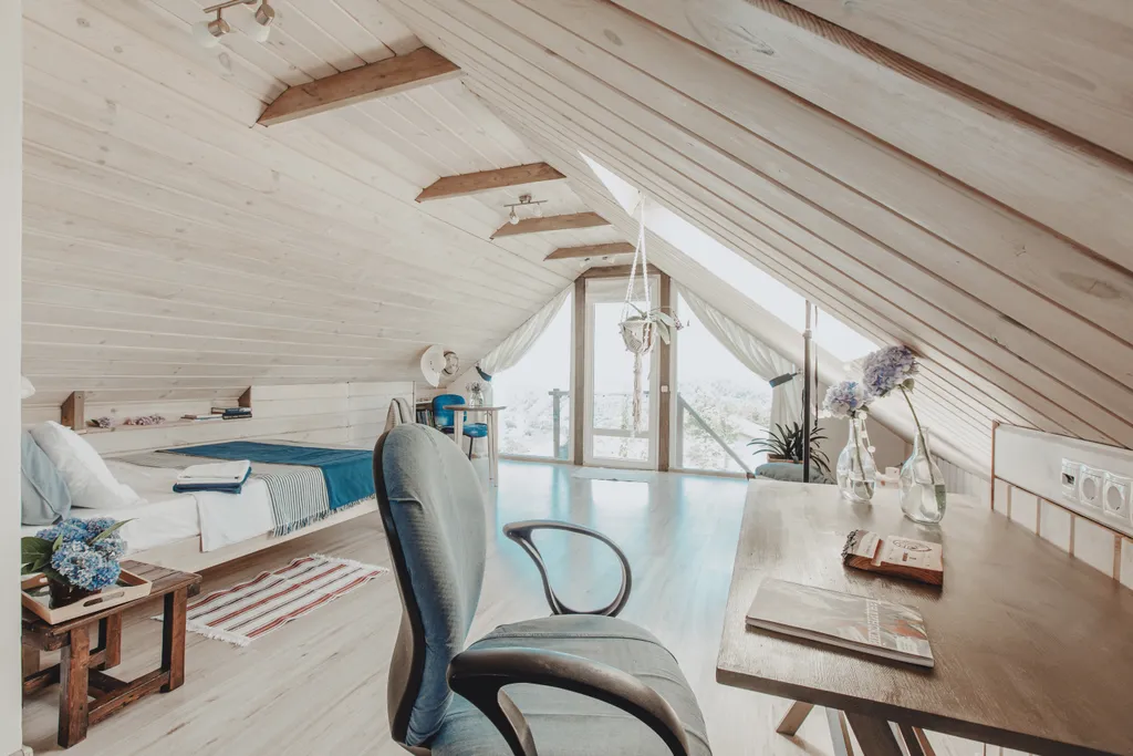 Мансарда (3-й этаж — 33 кв. м) — это единое пространство: спальня, рабочее место, кухня.