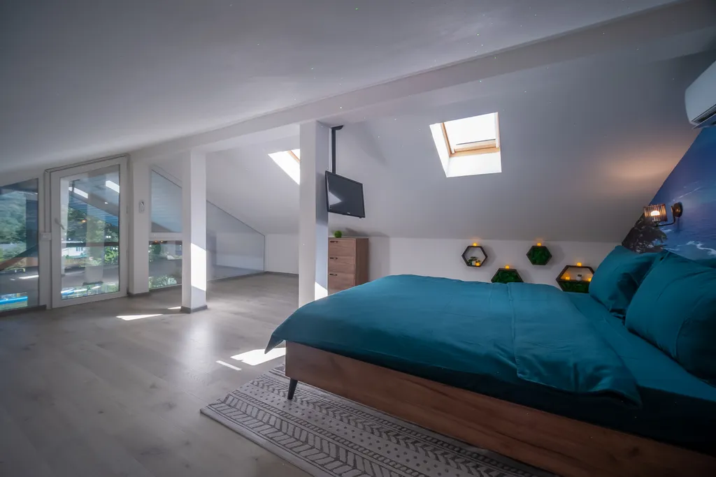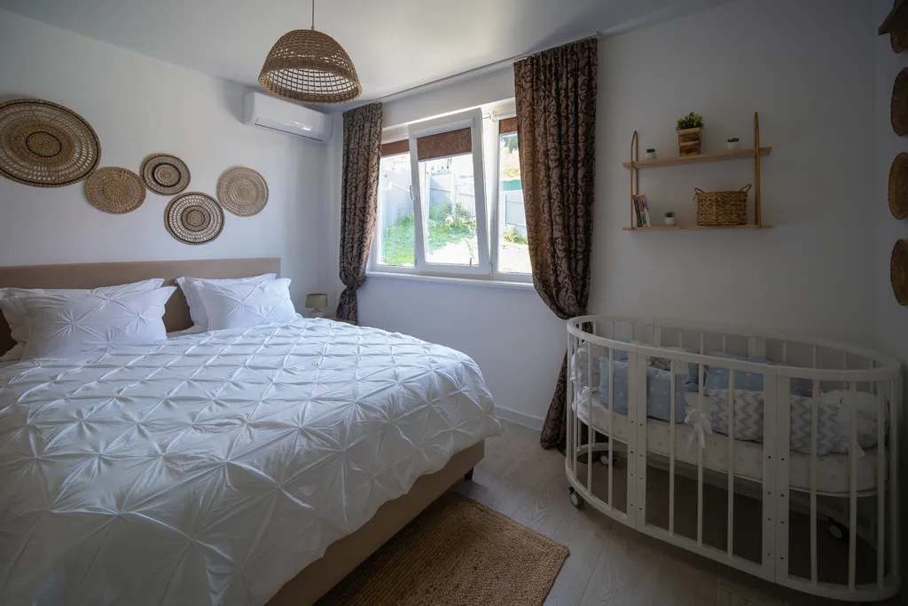 - спальня 1: двуспальная кровать 1,8×2,0 м + детская кроватка;