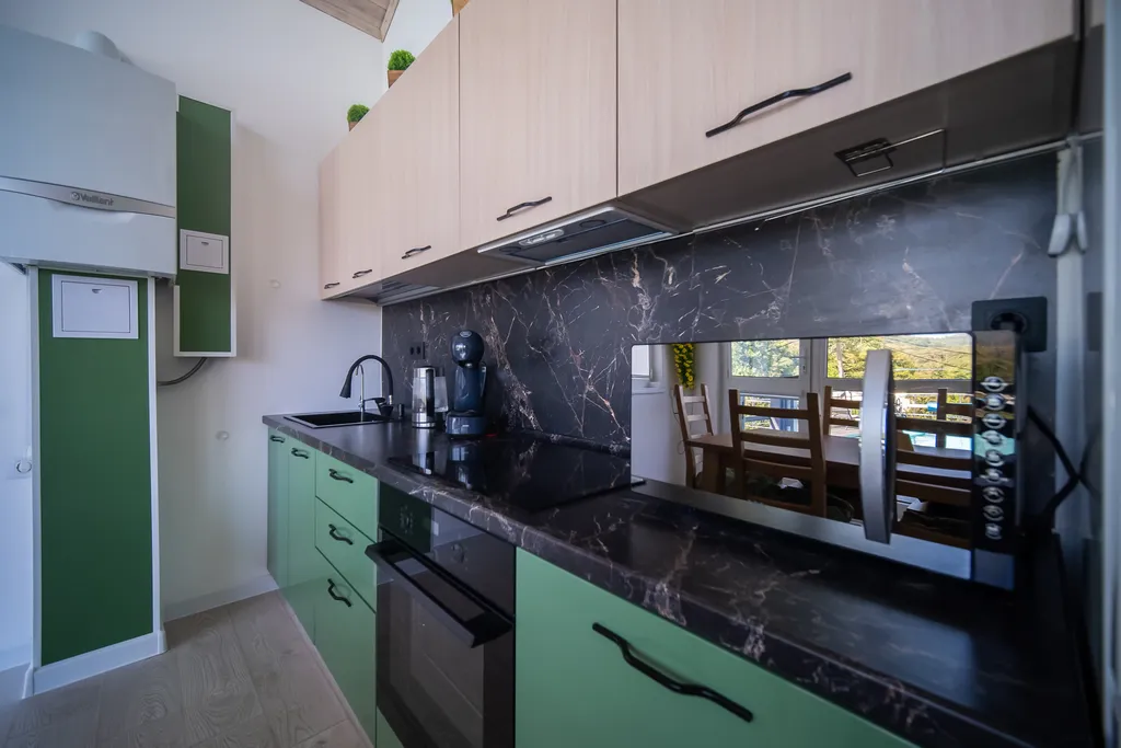 - полностью оборудованная кухня (варочная панель, духовка и др.);
