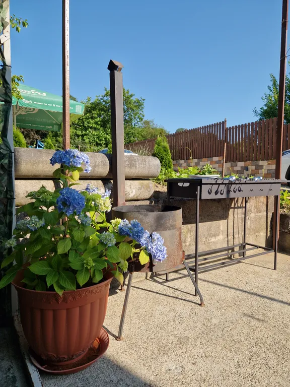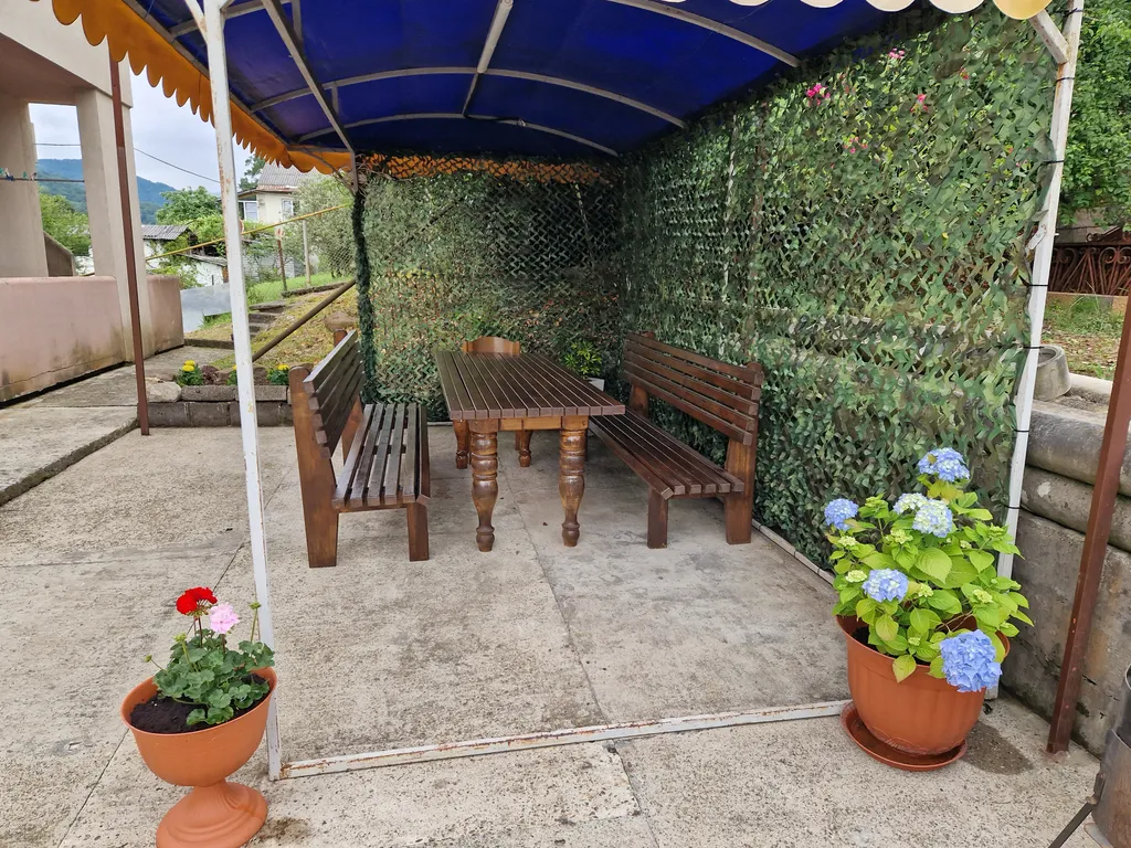 Во дворе есть беседка с большим столом, мангалом и казаном.