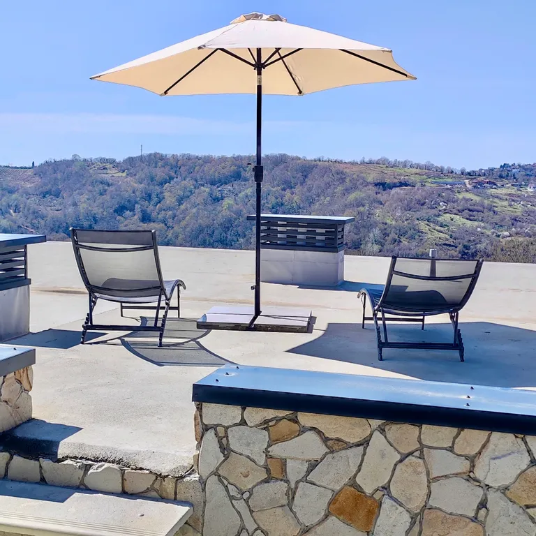 Мангальная зона с маркизой, шезлонги с зонтом на террасе на крыше.