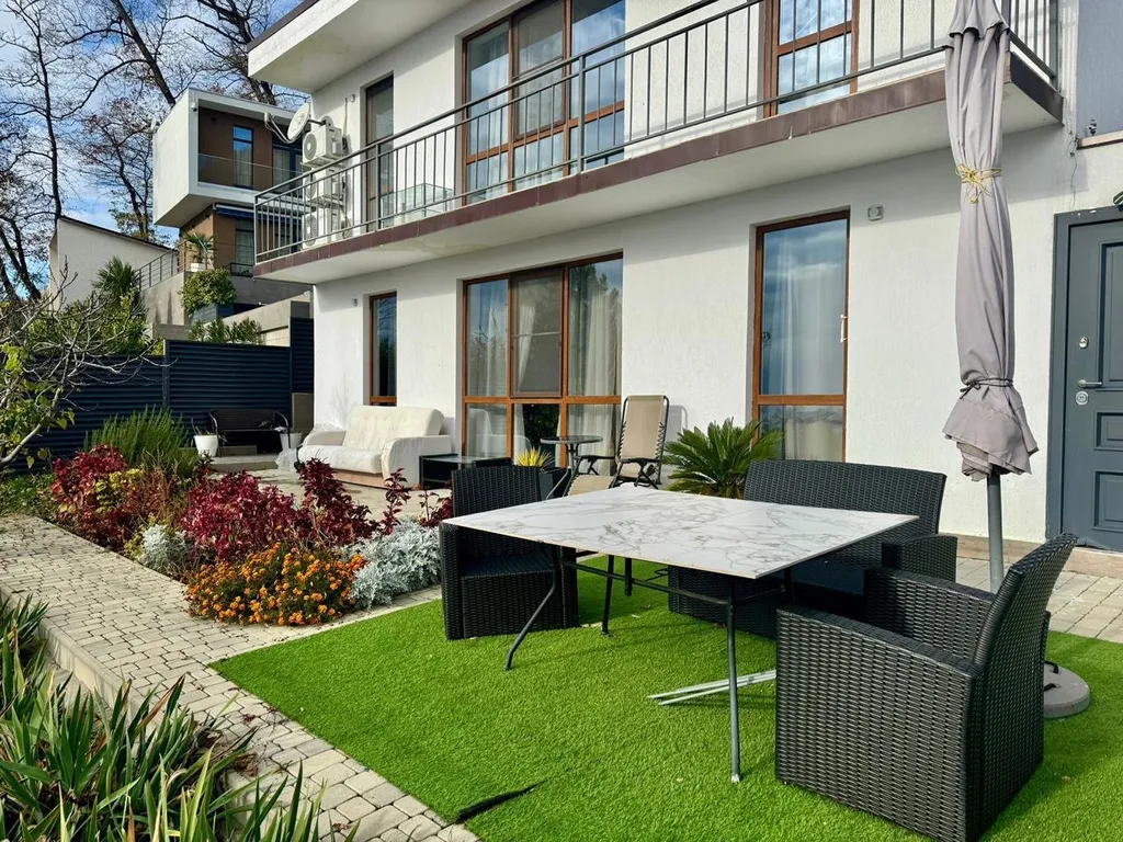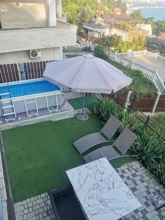 На участке расположена зона отдыха и зона барбекю. Есть бассейн. Небольшой сад: инжир сортовой, мандарины, лавр.