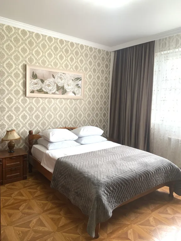 В доме выполнен ремонт в старинном классическом стиле, что даёт возможность погрузиться немного в старину. На этаже три спальные комнаты, ванная комната, кухня-столовая, зал, холл. В одной комнате — двуспальная кровать, кондиционер и телевизор, во второй комнате — двуспальная кровать, телевизор и кондиционер, третья комната — детская, с односпальной кроватью. В зале есть кондиционер, можно разместиться на раскладном диване вдвоём, на кухне также имеется кондиционер. Также можно посидеть на досуге в живописном дворе. Кто хочет тихое, спокойное проживание, тогда мы ждём вас!