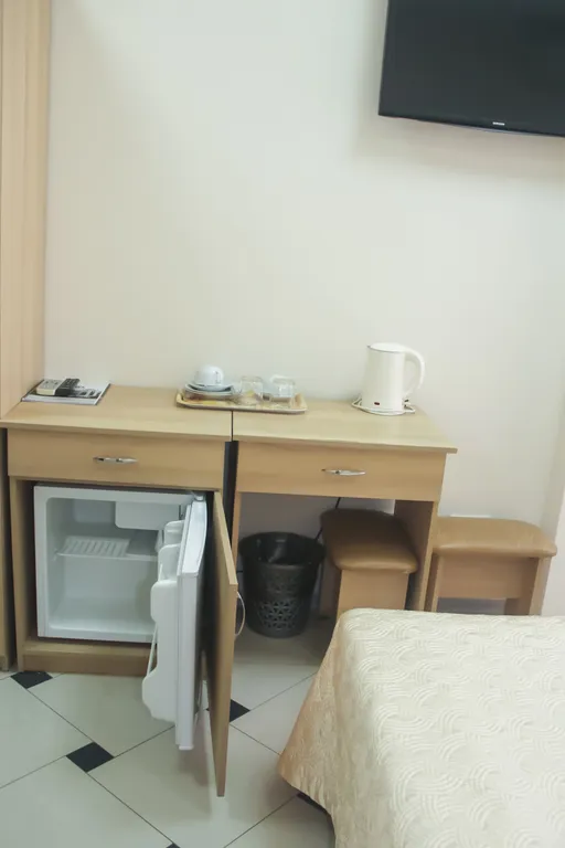 Номер оформлен в светлых тонах, оснащен новой мебелью: 2-односпальные кровати, размер 90х200, прикроватные тумбочки, туалетный столик, письменный стол, шкаф, зеркало, светильники. Номер имеет кондиционер, чайник, холодильник и телевизор с плоским экраном, транслирующий спутниковые каналы. Ванная комната укомплектована феном и набором туалетных принадлежностей. В распоряжении гостей собственная ванная комната с санузлом и душевой кабиной. В номере предусмотрена система противопожарной безопасности.