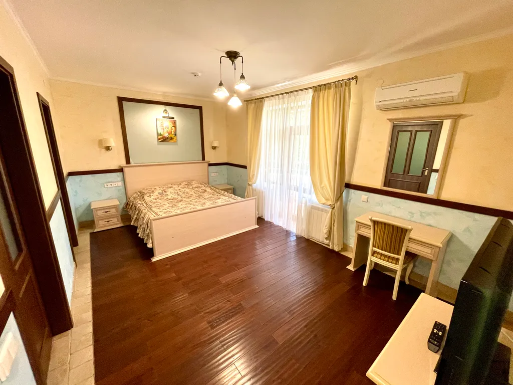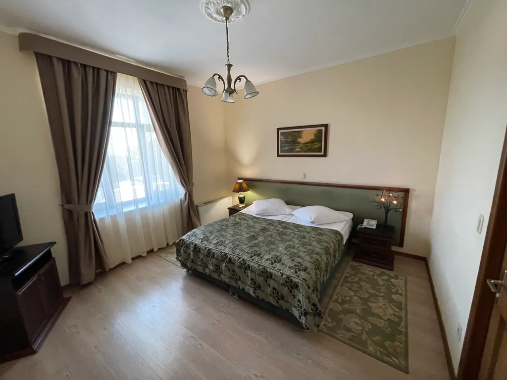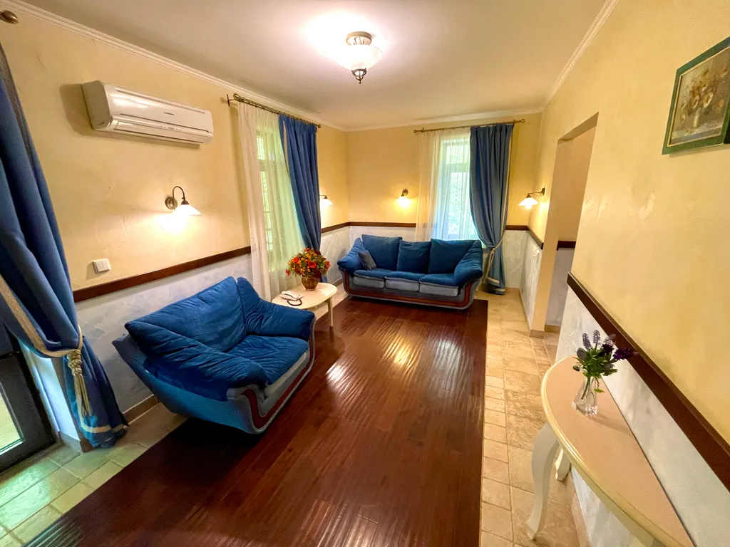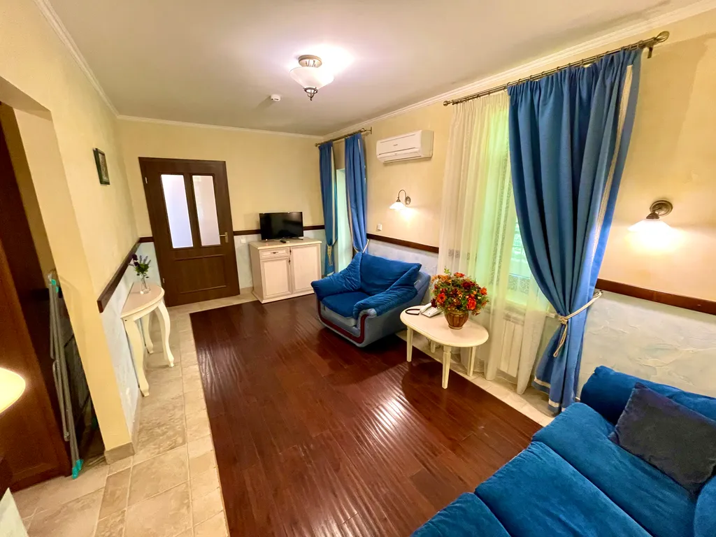 Номер оборудован 2 телевизорами, холодильником, 2 телефонами, сейфом. В номере имеются дополнительные места. Напольное покрытие – ламинат.