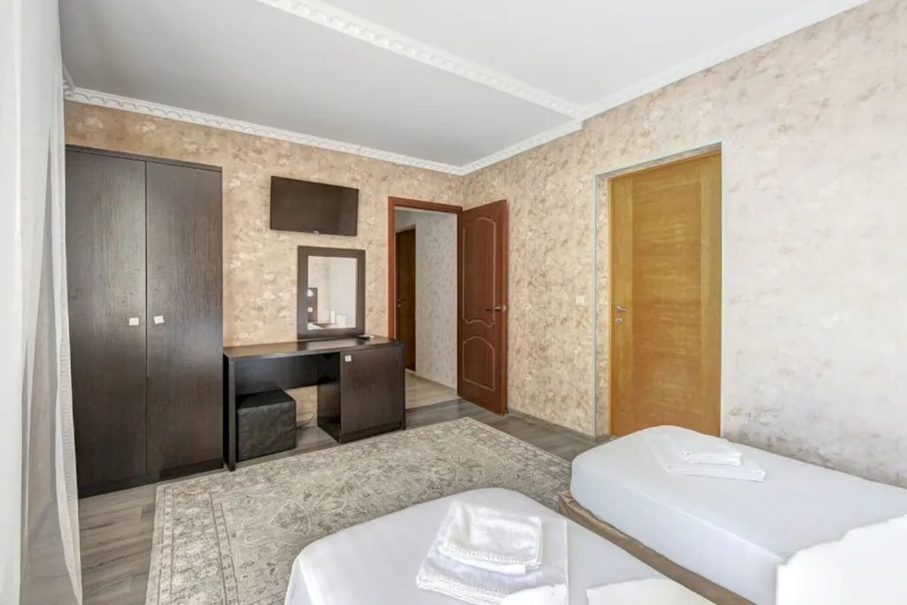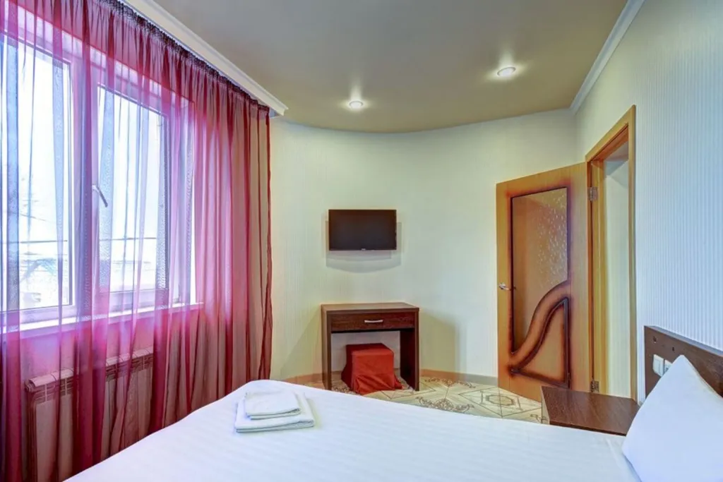 Для комфортного проживания в номере есть всё необходимое: кондиционер, телевизор, мини-холодильник, чайник, шкаф для одежды, прикроватные тумбы, столик и зеркало. Окна с плотными шторами обеспечивают хорошее естественное освещение днём и спокойный сон ночью.