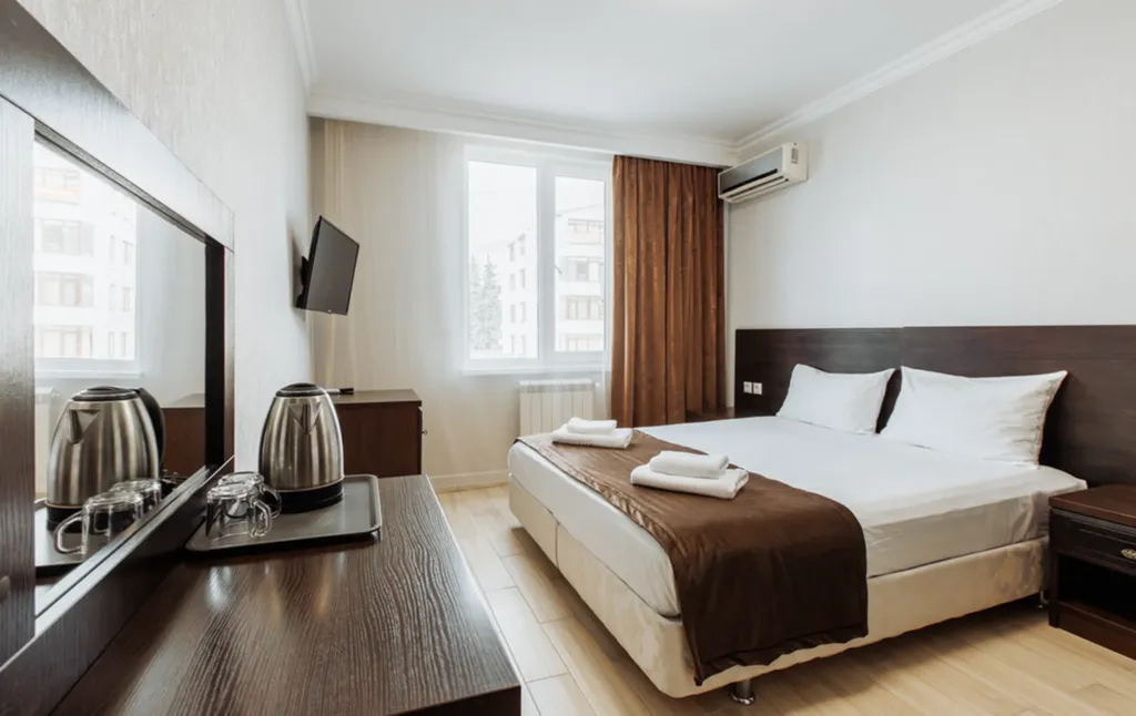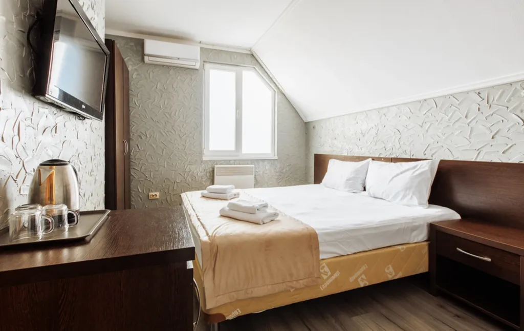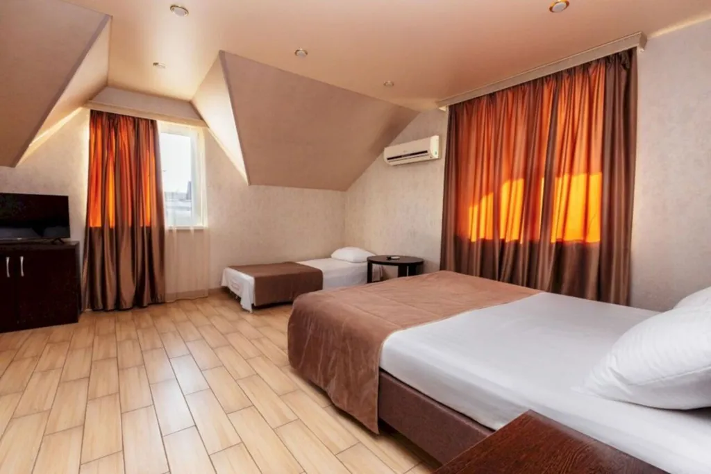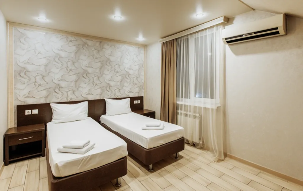 В номере есть всё необходимое для проживания: кондиционер, телевизор, мини-холодильник, чайник, шкаф для одежды, прикроватные тумбы, зеркало. Окна с плотными шторами наполняют комнату естественным светом днём и позволяют создать уютную атмосферу вечером.