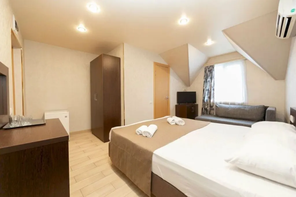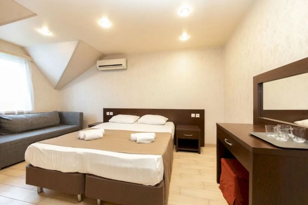 В номере предусмотрено всё необходимое для проживания: кондиционер, телевизор, мини-холодильник, чайник, шкаф для одежды, прикроватные тумбы, столик и зеркало. Окна с плотными шторами наполняют комнату естественным светом и позволяют создать уютную атмосферу в любое время суток