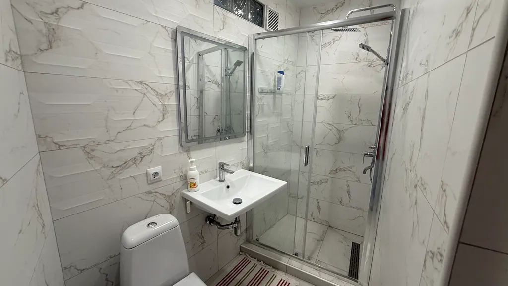 Ванная: тропический душ, раковина, унитаз, стиральная машина.