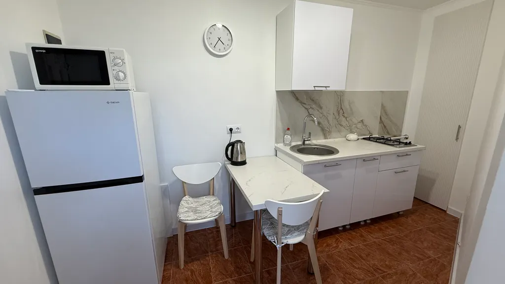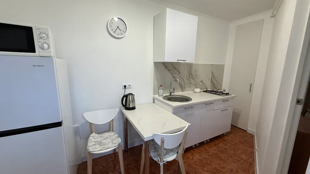 Кухня: кухонный гарнитур, газовая плита, микроволновая печь, обеденный стол, шкафы и ящики для кухонной утвари, холодильник No Frost, раковина, электрический чайник, посуда.