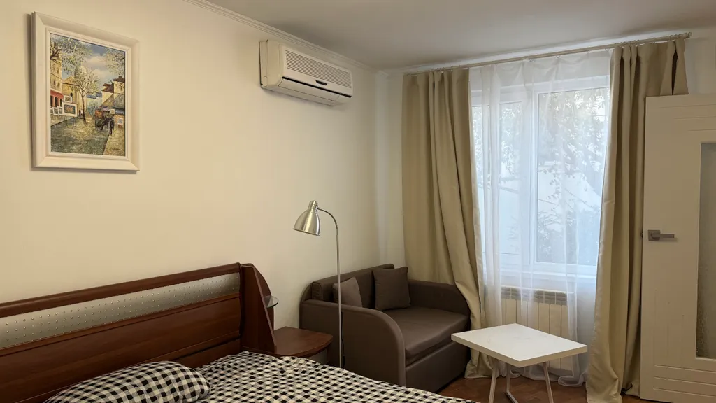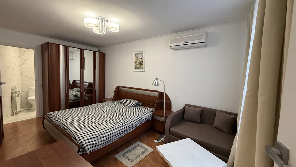 Комната: кондиционер, двуспальная кровать 140–200, диван-кровать (с ламелями), шкаф для одежды, журнальный столик, телевизор, утюг с гладильной доской, постельные принадлежности.