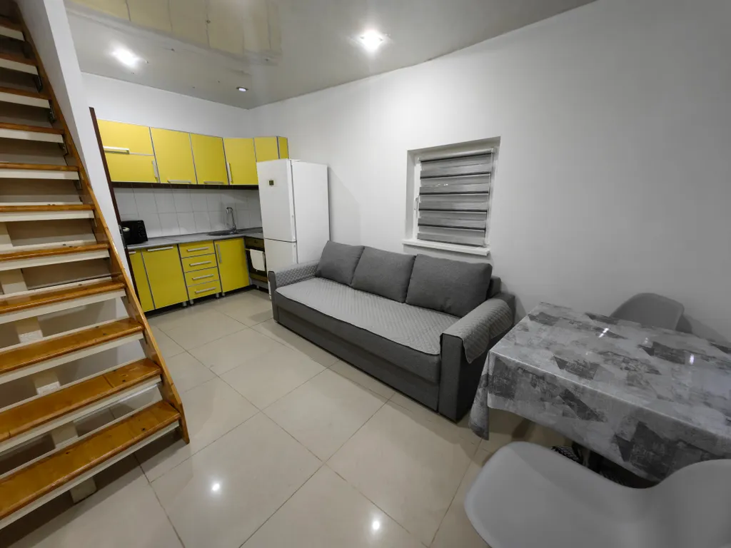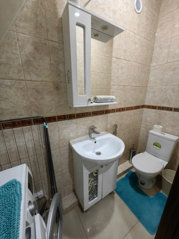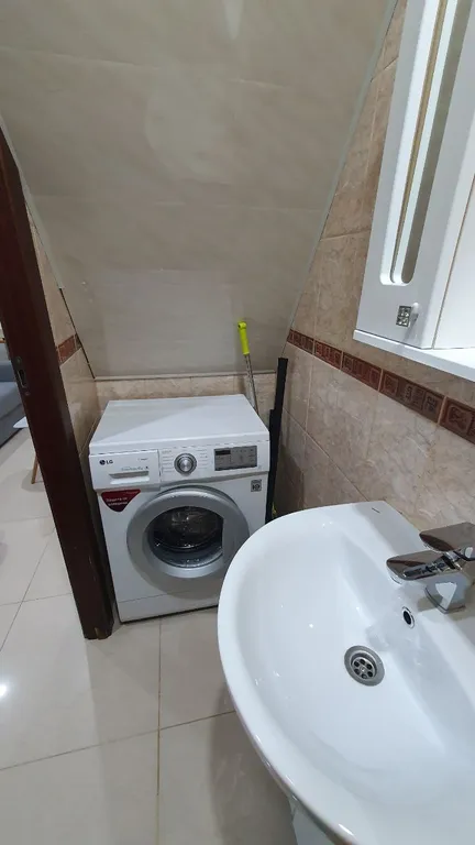 — На первом этаже: кухня-гостиная с раскладным новым диваном, вентилятор, а также микроволновка, холодильник, плита, духовка, телевизор, раковина. В туалете гигиенический душ и большая стиральная машинка, умывальник.