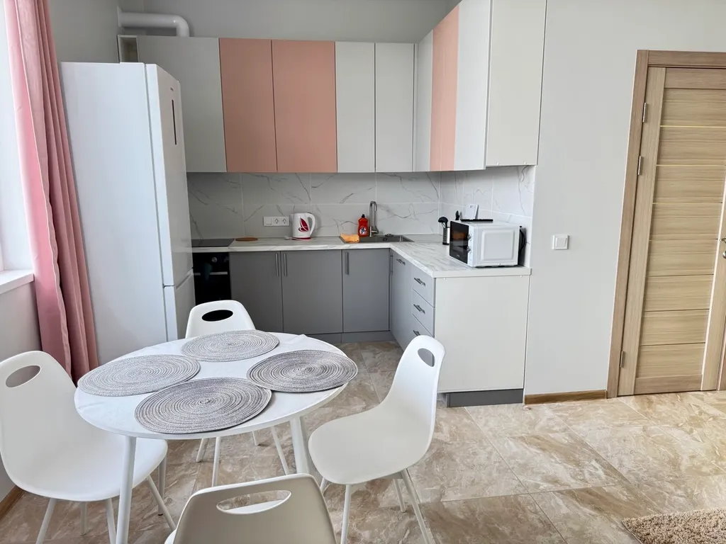 Полноценная кухня-гостиная укомплектована всем необходимым для приготовления домашних завтраков и ужинов. В наличии: современная варочная панель, микроволновая печь, посудомоечная машина, вместительный холодильник и электрический чайник. Мы подготовили полный набор посуды, сковородки, кастрюли и столовые приборы.